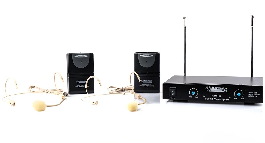 Audiodesign PMV 112 – Sistema wireless VHF con doppio trasmettitore bodypack con microfono headset color beige.