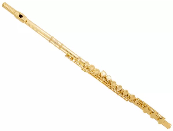 Flauto dorato con fori chiusi. E’ dotato di corpo e testata in alpacca dorata, chiave del MI snodata e trombino discendente al SI.
