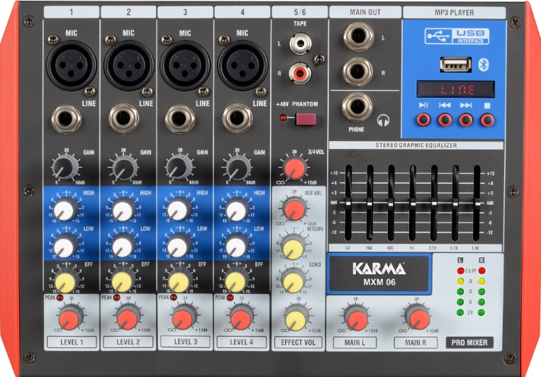 Mixer audio compatto che dispone di 6 canali per la miscelazione contemporanea di 4 segnali anche bilanciati (linea o mic), 1 canale tramite RCA (linea) e 1 segnale digitale (lettore Mp3 o bluetooth). Possiede un’equalizzatore grafico a 7 bande e effetto eco inseribile sui microfoni. I primi 4 canali possono gestire, tramite XLR anche microfoni a condensatore grazie all’alimentazione phantom. La presa USB permette il collegamento a PC per la gestione del mixer come fosse una scheda audio.