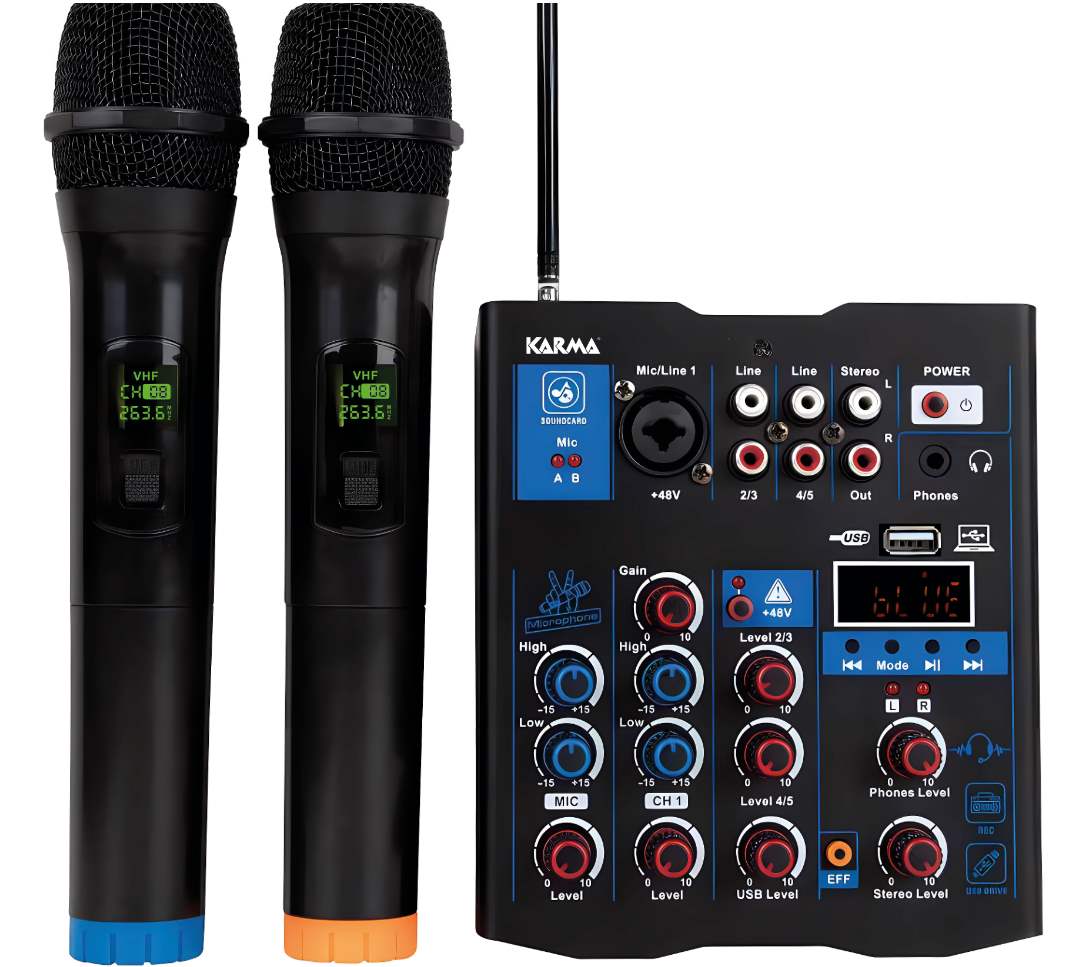 Mixer audio compatto e facilmente trasportabile si presta all’utilizzo nelle più svariate situazioni. Accetta 1 ingresso mic/line tramite connettore combo XLR/6,3mm e 2 ingressi di linea stereofonici tramite RCA. Unico nel suo genere, dispone di 2 radiomicrofoni per il pratico utilizzo durante feste, manifestazioni, premiazioni, battesimi etc.