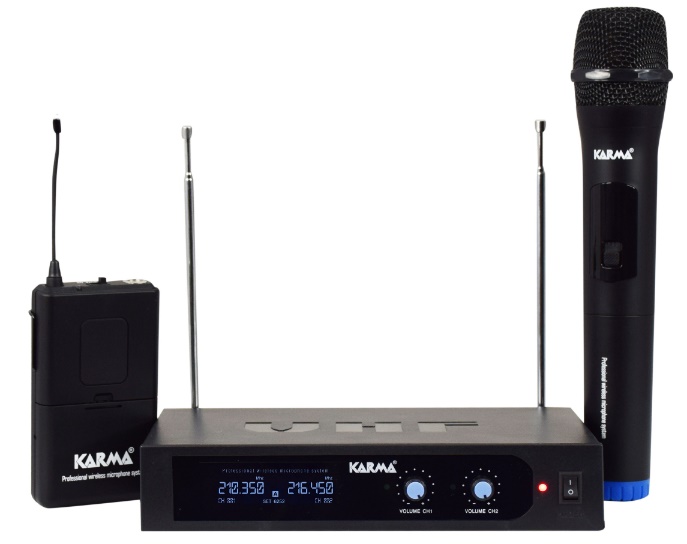 Doppio radiomicrofono VHF con regolatori di volume indipendenti e presa in uscita