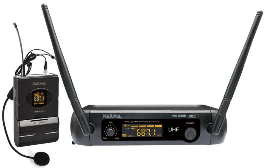 Radiomicrofono ad archetto operante in banda UHF. Sia il microfono che la base ricevente sono provvisti di display per il controllo della frequenza operativa e del livello di carica della batteria.