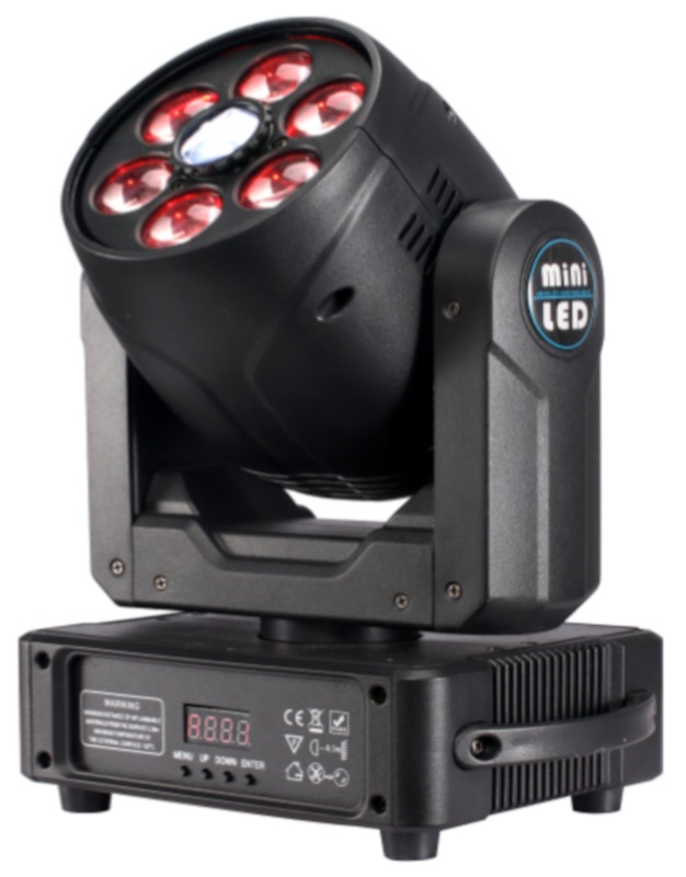 Straordinaria testa mobile composta da un proiettore centrale (30W) con ruota colori + ruota gobo e da 6 lenti esterne in grado di proiettare faci di luce in ogni colore grazie ai 6 potenti led RGBW da 10W. Il faro centrale riproduce in gobo triplicato mentre le sei lenti proiettano altrettanti fasci di luce concentrati con zoom variabile. Entrambi gli effetti ruotano in senso orario o antiorario grazie al motore interno. Infinite combinazioni permettono di avere sempre effetti differenti. Opera sia in automatico che a tempo di musica ma può essere pilotato da centraline DMX per impieghi professionali.