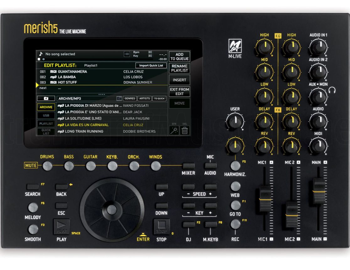 Una sola macchina per suonare e cantare in modo professionale. Il dispositivo stand alone dedicato alla lettura, archiviazione e riproduzione di basi musicali digitali che racchiude tutte le funzionalità del Merish 5 con una velocità raddoppiata e la possibilità di editare i file audio a tracce separate con i file MTA (formato realizzato da M-live). Legge e suona i file con estensione .wav / .aac / .ogg / .flac / .aif / .au, inoltre con il plugin Prompter in dotazione che permette di connettersi sul palco a device come tablet o smartphone per visualizzare in remoto su più postazioni testi e accordi delle canzoni in esecuzione. Due grandi novità del Merish5+ plus sono i plugin in dotazione, unici nel loro genere, che interagiscono con le App Android o iOS. Con Prompter è possibile visualizzare testi e accordi in remoto anche a decine di metri di distanza: perfetto per gestire più postazioni sul palco tramite Smartphone o Tablet. Grinta Live permette al pubblico di interagire in diretta con te: consultare tramite smartphone o tablet il repertorio musicale presente sul Merish5+ plus, inviare richieste e leggere i testi delle canzoni o prenotarsi per un karaoke live. Merish5+ include tutti i suoni che erano presenti nelle precedenti versioni, ma tantissimi di questi sono stati rielaborati, ricampionati e ottimizzati perchè lo spazio di memoria disponibile è dieci volte più grande. Il database sonoro di Merish5+ è all’altezza delle esigenze di chi deve esibirsi professionalmente dal vivo. Merish5+ può essere suonato utilizzando una Master Keyboard anche di tipo USB che, una volta collegata, sarà alimentata e pronta a suonare il database interno di Merish5+. Una master keyboard e Merish5+ rappresentano il connubio ideale per chi vuole ottimi suoni, e prestazioni senza compromessi in termini di controllo e gestione di archivi musicali.