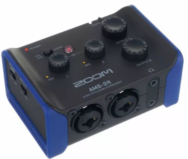 La Zoom AMS-24 è perfetta per streaming solisti e sessioni multi-strumento. Dispone di due ingressi combo XLR/TRS insieme ai preamplificatori Zoom a basso rumore . Sono incluse anche due uscite per cuffie e due uscite TRS per monitor esterni. Puoi passare dalla registrazione allo streaming in diretta con lo switch Music / Streaming.